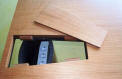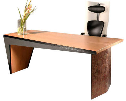 Basistisch in europäischem Kirschbaum furniert, Wangen in Eiche schwarz und Rautenfuß in Kupfer antik